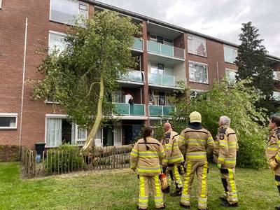 Aan de Bukhorst in Deventer is vanmiddag een boom tegen een flatgebouw gevallen. Het metershoge exemplaar werd geveld door de storm.